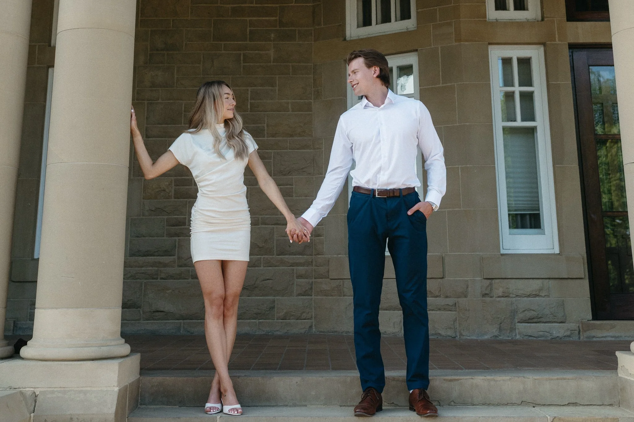 There’s something incredibly timeless about engagement photos that feel natural, unforced, and quietly refined. Nicole and Josh’s engagement session at Government House in Edmonton, Alberta felt effortless—but still intentional. I love to create engagement imagery that has a loose editorial feel by using relaxed movement, subtle emotion, and a setting that complements without overpowering. Situated above Edmonton’s river valley, Government House is one of the most beautiful and versatile photo locations the city has to offer. With historic architecture, manicured grounds, and scenic river views, it offers an editorial backdrop that feels both classic and elevated.